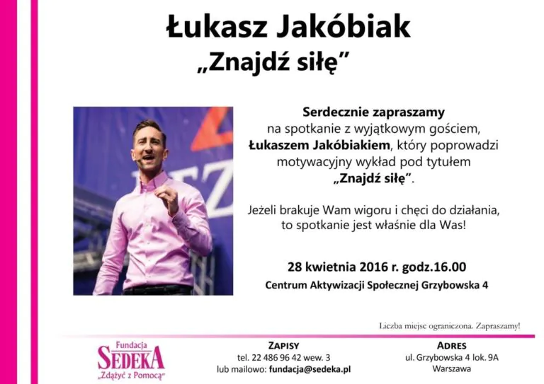 Zapraszamy na wykład motywacyjny „Znajdź siłę” Łukasza Jakóbiaka, który odbędzie się w czwartek 28 kwietnia w naszym Centrum Aktywizacji Społecznej Grzybowska 4.