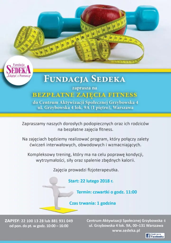 Zapraszamy na bezpłatne zajęcia fitness dla dorosłych podopiecznych Fundacji Sedeka.