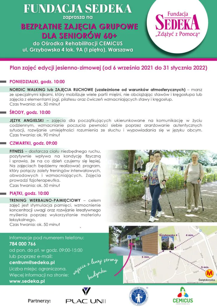 Zapraszamy seniorów 60+ do udziału w jesienno-zimowej edycji bezpłatnych zajęć grupowych, które odbywać się będą w Ośrodku Rehabilitacji CEMICUS przy ulicy Grzybowskiej 4, lok. 9A w Warszawie. Zaczynamy już 6 września!