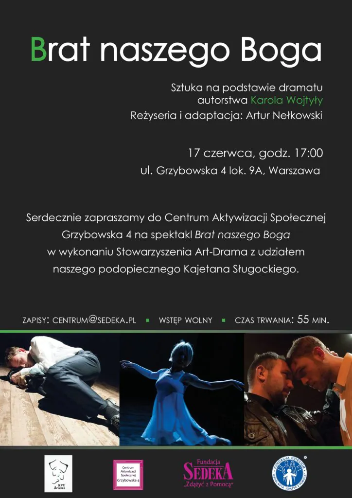 Serdecznie zapraszamy na spektakl „Brat naszego Boga” na podstawie dramatu autorstwa Karola Wojtyły w wykonaniu Stowarzyszenia Art-Drama.