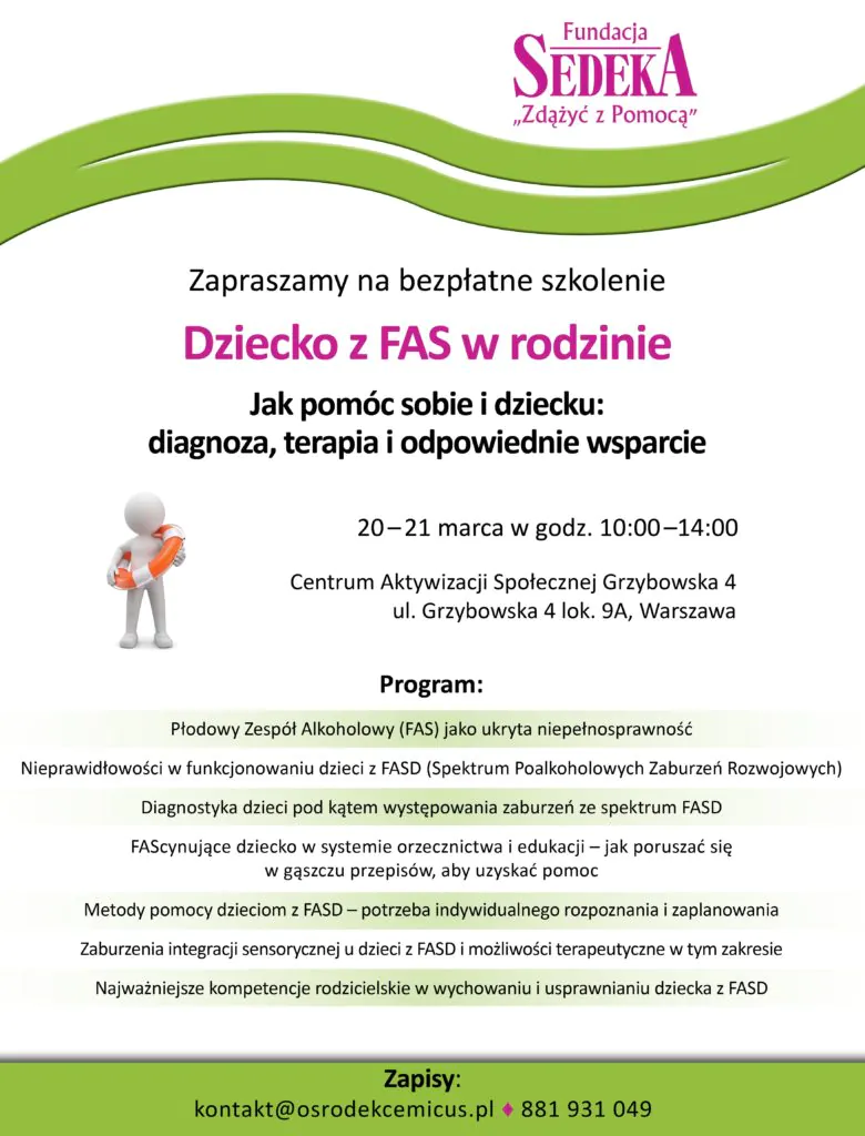 Zapraszamy na bezpłatne szkolenie „Dziecko z FAS w rodzinie – jak pomóc sobie i dziecku. Diagnoza, terapia i odpowiednie wsparcie”.