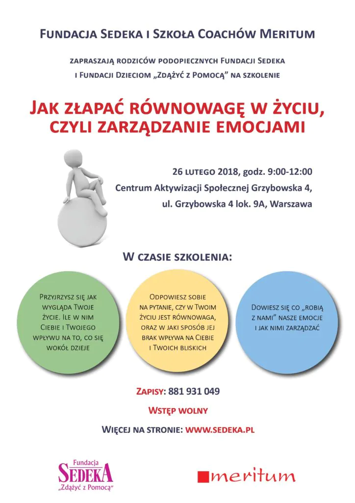 Zapraszamy rodziców podopiecznych naszej Fundacji na bezpłatne szkolenie „Jak złapać równowagę w życiu, czyli zarządzanie emocjami”.