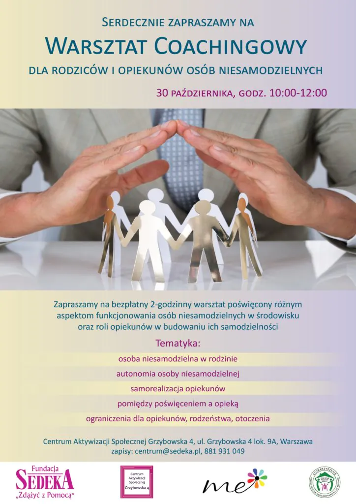 30 października br. zapraszamy na bezpłatny 2-godzinny warsztat coachingowy dla rodziców/opiekunów osób niepełnosprawnych poświęcony aspektom funkcjonowania osoby niesamodzielnej w środowisku oraz roli opiekunów w budowaniu ich samodzielności.