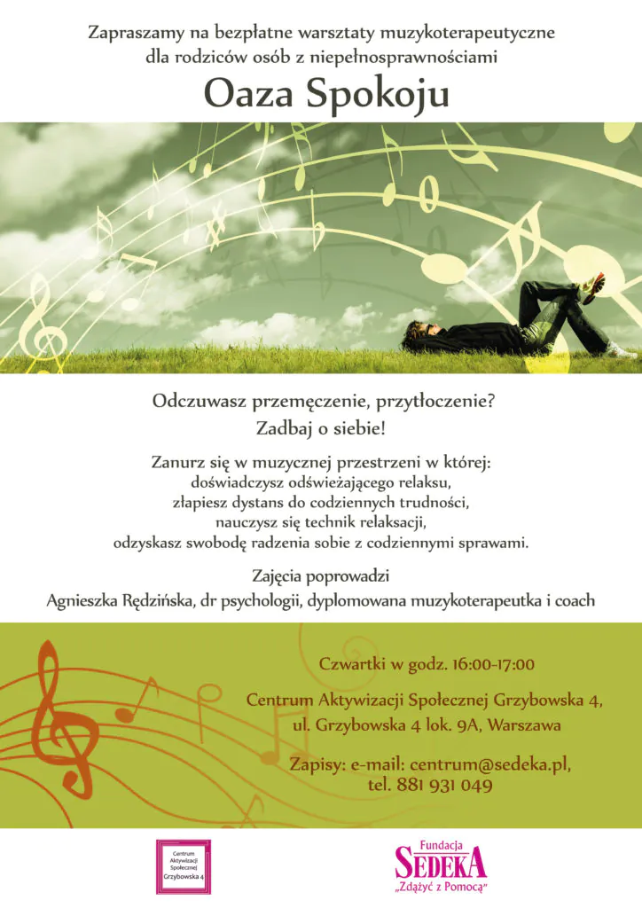Zapraszamy rodziców osób z niepełnosprawnościami na bezpłatne warsztaty muzykoterapeutyczne “Oaza Spokoju”, które odbędą się w Centrum Aktywizacji Społecznej Grzybowska 4 w Warszawie.