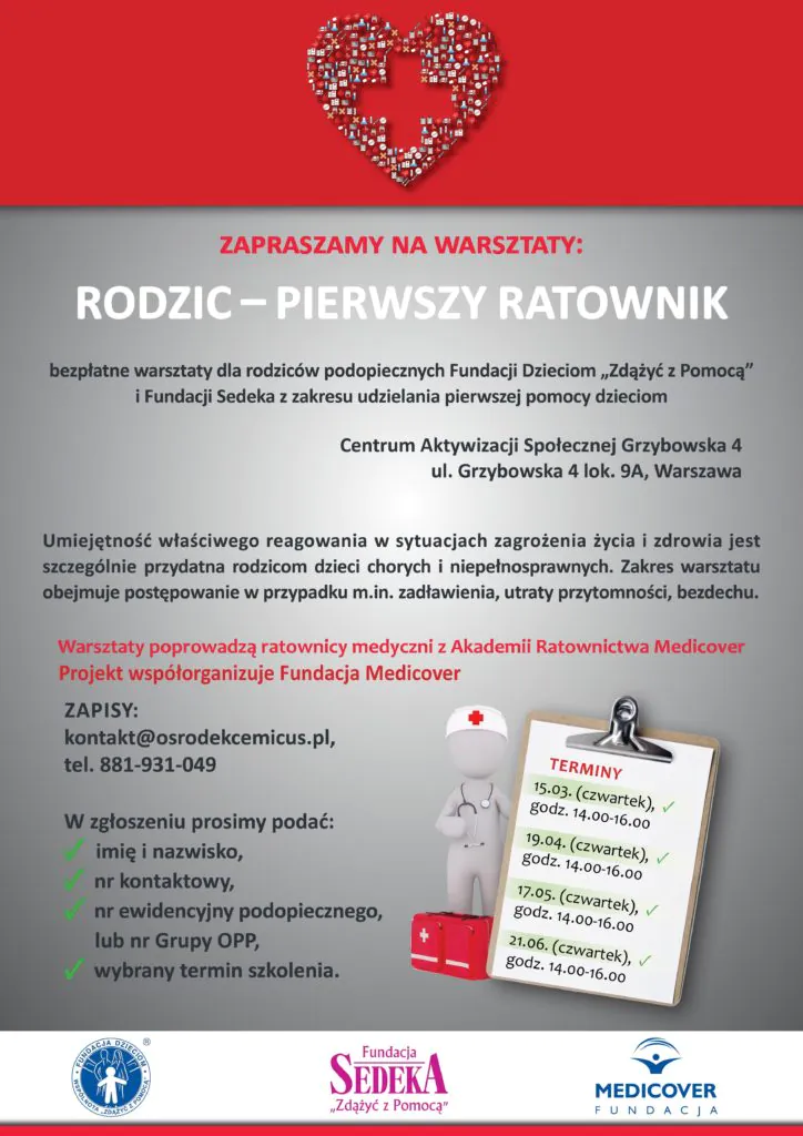 Zapraszamy na bezpłatne warsztaty dla rodziców podopiecznych Fundacji Sedeka z zakresu udzielania pierwszej pomocy dzieciom.