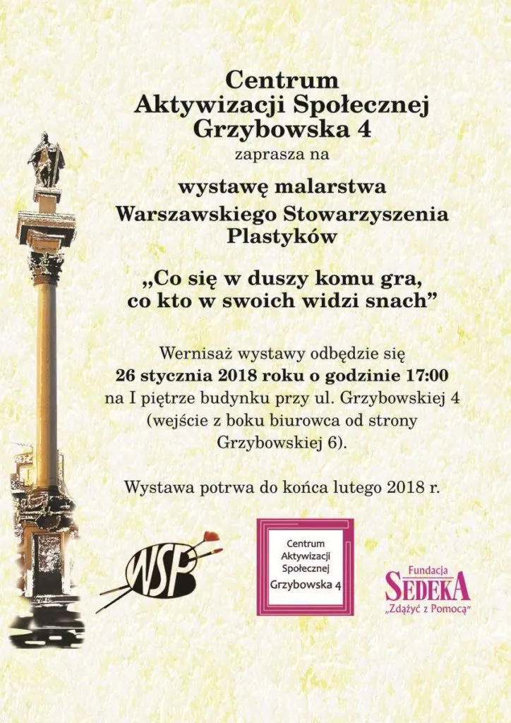 Zapraszamy 26 stycznia br. (piątek) do Centrum Aktywizacji Społecznej Grzybowska 4, działającego w ramach Fundacji Sedeka, na wernisaż wystawy malarstwa Warszawskiego Stowarzyszenia Plastyków.