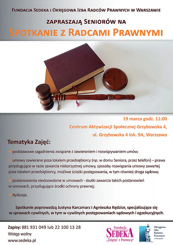 Zapraszamy seniorów na spotkanie z radcami prawnymi z Okręgowej Izby Radców Prawnych w Warszawie.