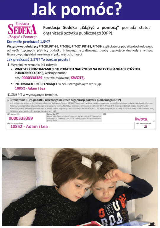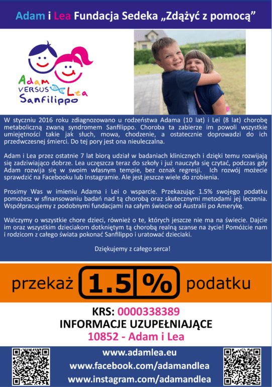 Adam i Lea – niezwykłe rodzeństwo, którego narodziny dzieli 16 miesięcy, a łączy wielka miłość i śmiertelna genetyczna choroba metaboliczna MPSIII, zwana także Sanfilippo. Choroba, która pozwala stosunkowo normalnie rozwijać się jedynie do ok. 3-4 roku życia, a nieleczona zabierze im wszystko zanim osiągną pełnoletność; utracą zdobyte umiejętności, a finalnie i życie. By przyszłość Adama i Lei była inna, zbieramy środki na leczenie Sanfilippo. Na świecie prowadzone są badania nad tą chorobą, obecnie w formie testów klinicznych na ludziach. Jeśli się uda, Adam i Lea mają szansę wyzdrowieć!