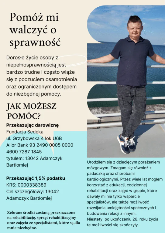 Zbiera środki na terapię, zakup sprzętów rehabilitacyjnych, aktywizację społeczną i dojazdy do lekarzy specjalistów.