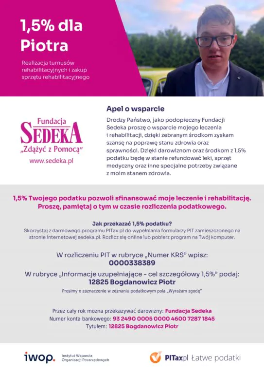 Potrzebuje pomocy w zebraniu środków na turnusy rehabilitacyjne oraz zakup sprzętu rehabilitacyjnego.