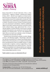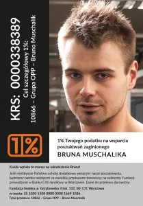 W lipcu 2015 r. obronił tytuł magistra na Uniwersytecie Ekonomicznym w Katowicach. Od września miał rozpocząć pracę w jednej z dużych firm audytorskich w Krakowie. Przed rozpoczęciem pracy zaplanował trzytygodniowe wakacje w Indiach. W podróż wyruszył 30 lipca i do dnia 8 sierpnia cały czas pozostawał w kontakcie z bliskimi, publikował zdjęcia na portalach społecznościowych, przesyłał wiadomości, zdawał relację z tego, gdzie bywał. Noc z 8 na 9 sierpnia spędził w hostelu Manalsu Guest House w Manali. Stamtąd miał pojechać rano autobusem do Parvati Valley. Niestety od 9 sierpnia 2015 r. nie ma z nim żadnego kontaktu. Bruno nie stawił się na lotnisku w dniu 22 sierpnia na wykupiony lot powrotny do Polski. Niestety koszty poszukiwań są bardzo wysokie, dlatego prosimy o 1,5% Waszego podatku oraz wpłaty darowizn. Rodzice Bruna zdecydowali się na wynajęcie profesjonalnej firmy poszukiwawczej, która ma wielkie sukcesy w odnajdywaniu ludzi w regionie, w którym zaginął Bruno. Koszt takiego przedsięwzięcia jest jednak ogromny i znacznie przekracza posiadane oraz zebrane dotychczas fundusze. Prosimy Was więc o wsparcie. To dla rodziców i bliskich Bruna najważniejsza sprawa w życiu.